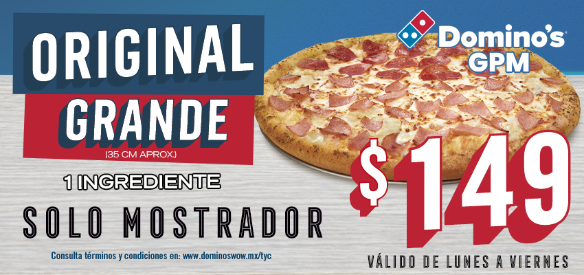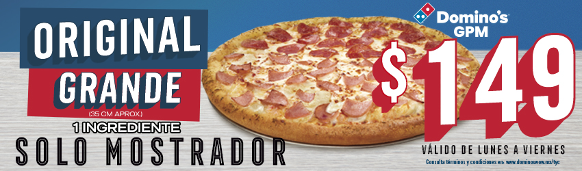 PIZZA ORIGINAL GRANDE (35 CM APROX) POR $129.00 1 INGREDIENTE SOLO MOSTRADOR VALIDO DE LUNES A VIERNES. SUCURSAL: UNACH, BOULEVARD, TECNOLÓGICO, PLAZA SOL, PLAZA CRYSTAL, GALERÍAS Y TERAN